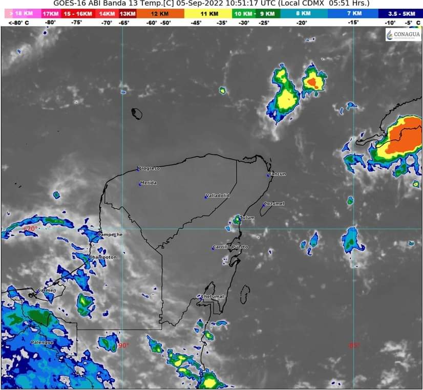 1.-Vaguada térmica (canal de baja presión) ubicada en superficie sobre la porción oeste de la Península de Yucatán, en su amplia circulación impulsa aire marítimo tropical con variable contenido de humedad del citado golfo y del mar Caribe hacia la región peninsular; originando temperaturas calurosas y bochornosas durante el día y parte de la noche, cielo medio nublado con nublados dispersos, lluvias dispersas con intervalos de chubascos acompañados de actividad eléctrica durante el transcurso del día, más frecuentes por la tarde o noche sobre algunas zonas del estado de Quintana Roo.