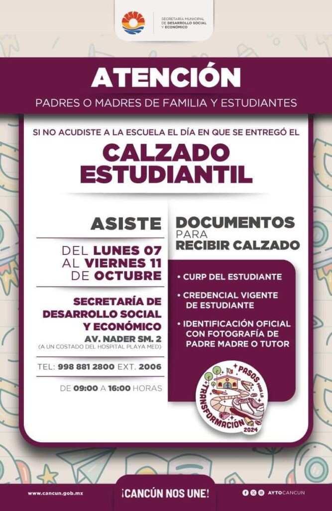 Cancún(Marcrix Noticias).- Como parte del programa Pasos para la Transformación: Calzado Escolar 2024, se entregarán tenis a más de 122 mil estudiantes de Cancún.