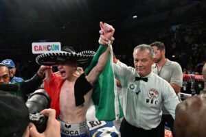 Cancún, (MARCRIX Noticias).- Con mucha voluntad, corazón y estamina, William “camarón” Zepeda retuvo el campeonato interino del Consejo Mundial de Boxeo (WBC) al derrotar por decisión mayoritaria al norteamericano Tevin Farmer quien dio una gran pelea ante más de 10 mil aficionados que hicieron un lleno histórico en el Poliforum Cancún en lo que fue el combate estelar de la función “The Rematch” producida por “Golden Boy Promotions” de Oscar de la Hoya y “Cancun Boxing” de Pepe Gómez