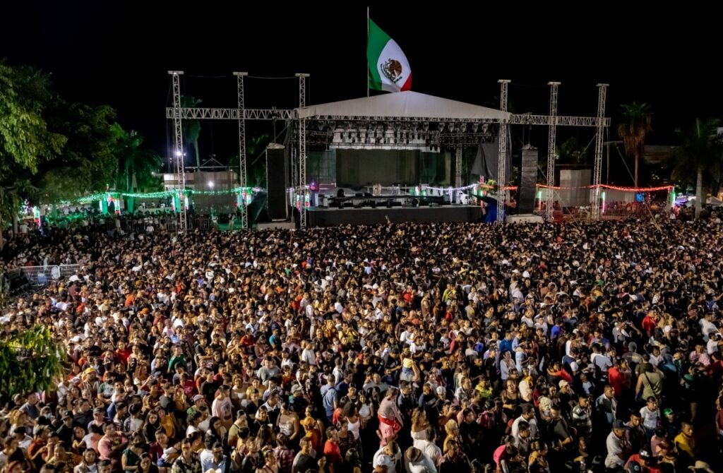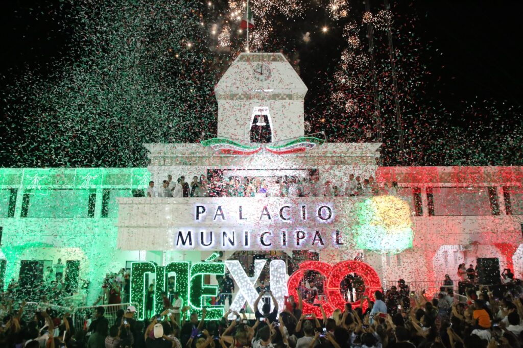 Playa del Carmen, Solidaridad, 15 de septiembre de 2022.- Ante más de 15 mil habitantes locales y visitantes, la presidenta Lili Campos dió el tradicional Grito de Independencia desde el palco del Palacio Municipal, ondeando la bandera de México y repicando la campana.