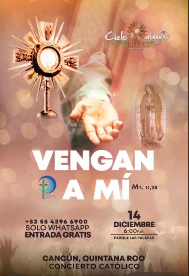 Cancún, Quintana Roo.- La Diócesis de Cancún-Chetumal y “Cielo Abierto” invitan a la comunidad al magno concierto gratuito de adoración eucarística ante el Santísimo Sacramento del Altar, que se llevará a cabo el sábado 14 de diciembre, a las 6:00 P.M. en el Parque de las Palapas.