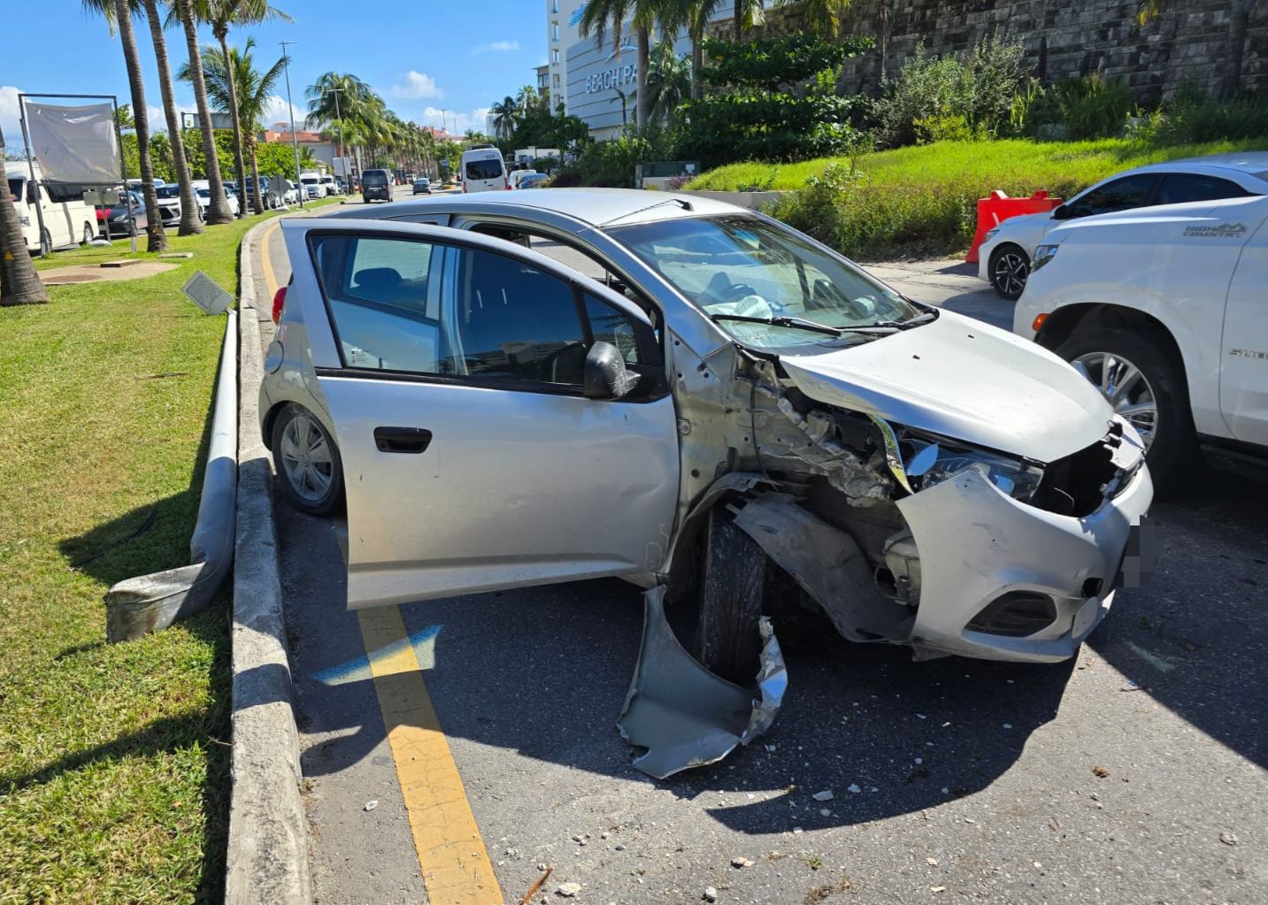 Un automóvil Beat color gris impactó contra un poste de alumbrado público en la zona hotelera de Cancún tras perder el control.