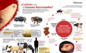 La miasis, es una infección parasitaria provocada por larvas de moscas que se alimentan de tejido vivo. En el caso del gusano barrenador, las hembras depositan huevos sobre heridas abiertas; al eclosionar, las larvas penetran en la piel y provocan infecciones severas si no se tratan a tiempo.