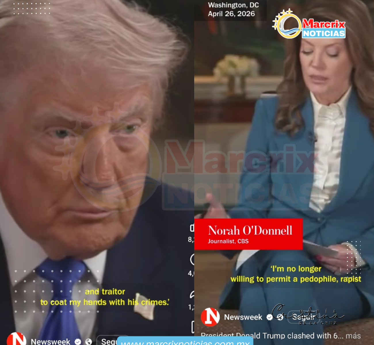 Estados Unidos. ( Marcrix Noticias).- El presidente Donald Trump confrontó a la periodista Norah O’Donnell durante una entrevista en el programa 60 Minutes, luego de que se abordara el contenido del manifiesto del atacante vinculado al tiroteo en la cena de la Asociación de Corresponsales de la Casa Blanca.