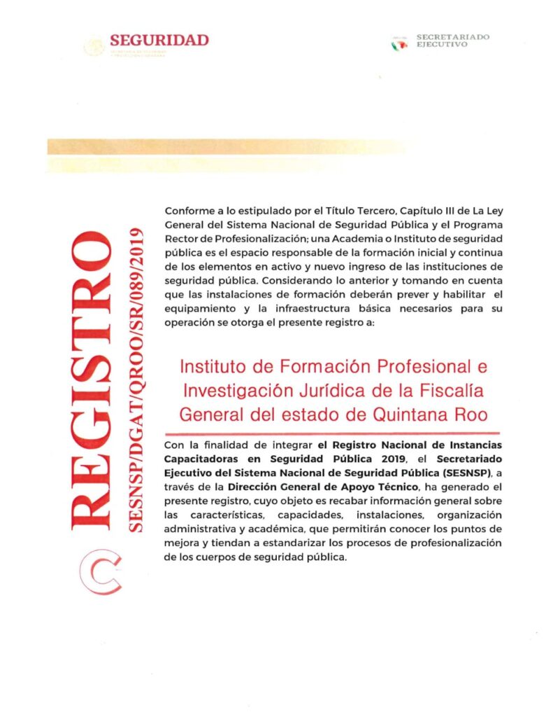Por su parte, el SESNSP establece que el registro otorgado a la Fiscalía General del Estado de Quintana Roo, tiene como objetivo recabar información general sobre las características, capacidades, instalaciones, organización administrativa y académica que permitirán conocer los puntos de mejora y tienden a estandarizar los procesos de profesionalización de los cuerpos de seguridad pública.