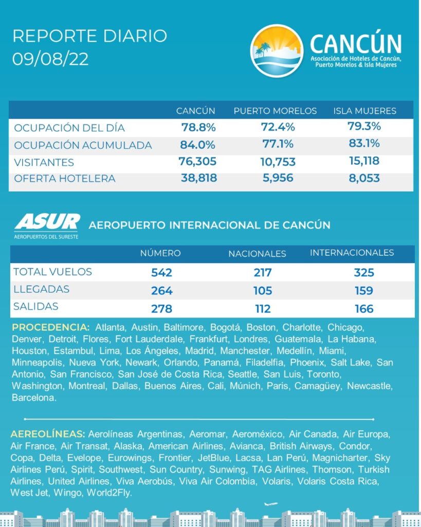 Este día, Cancún reportó que tiene una ocupación del 78.8%, Puerto Morelos de 72.4%, mientras el mejor es Isla Mujeres con 79.3%.