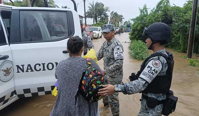 A bordo de lanchas tipo Zodiac y en vehículos oficiales, personal de la Guardia Nacional traslada a los afectados a refugios temporales habilitados en la entidad, donde se les brinda alimento, colchonetas y cobijas.
