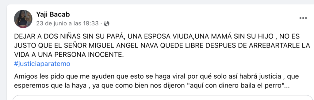 Con el hashtag #Justiciaparatemo, la esposa de la víctima está convocando la marcha para el próximo jueves 29 de junio a las 5 de la tarde, teniendo como punto de encuentro la glorieta de “El Ceviche” y finalizando frente a las instalaciones de la Fiscalía de Quintana Roo.