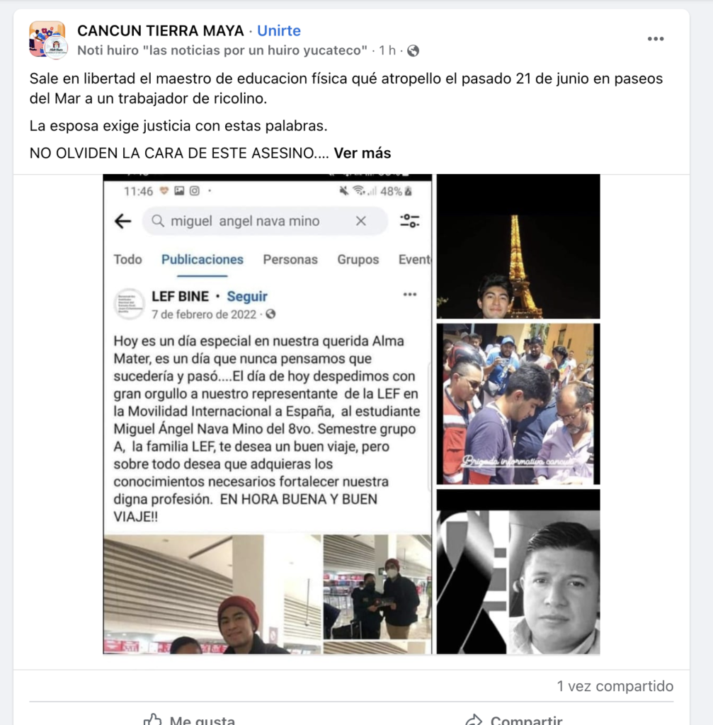 Cancún (Marcrix Noticias).- A través de redes sociales, familiares y amigos están convocando a una marcha para exigir justicia por Artemio, chofer repartidor de la empresa Ricolino que fue brutalmente atropellado y perdiera la vida en el fraccionamiento Paseos del Mar de Cancún.