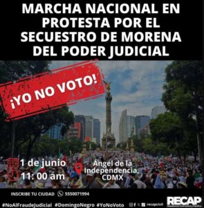 Ciudad de México (Marcrix Noticias).– Organizaciones de la sociedad civil, usuarios en redes sociales y figuras públicas han convocado a una mega marcha nacional el próximo 1 de junio, para manifestarse contra la elección judicial, el proceso con el que se renovarán más de 800 cargos del Poder Judicial de la Federación.