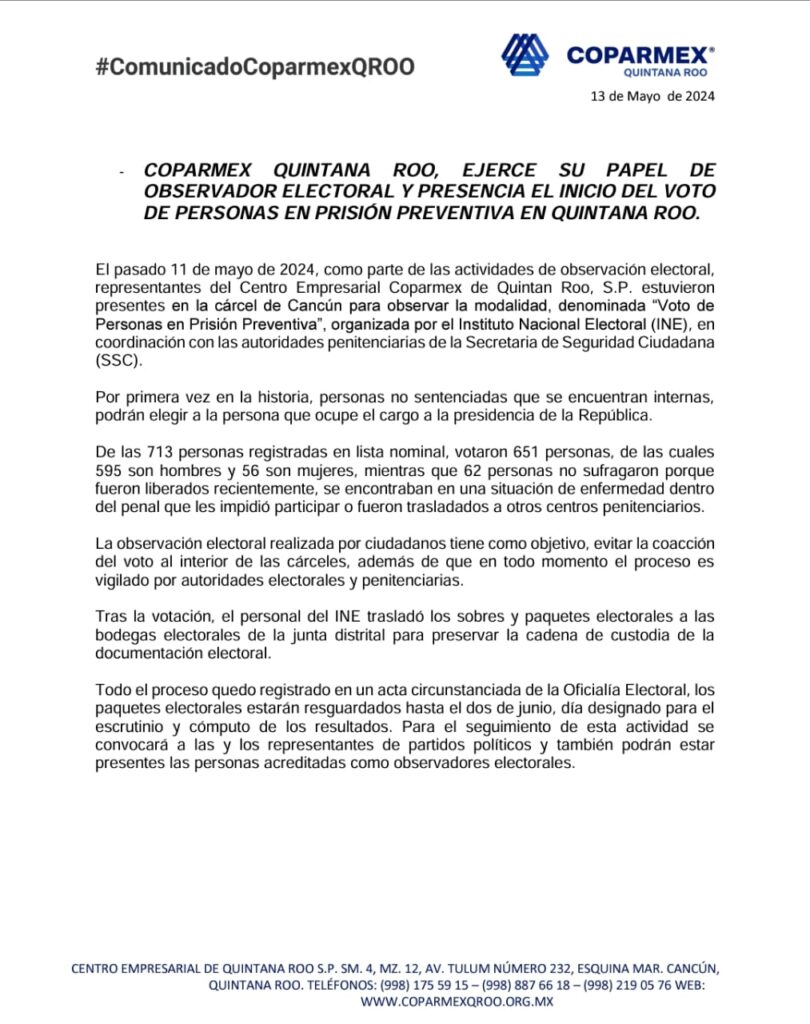 Mediante un comunicado la presidenta del organismo empresarial, Angélica Frías, precisó que en total se tenían registrados 713 electores en la lista nominal en este centro penitenciario ubicado en Cancún, de los cuales emitieron su voto 651 internos, de los cuales 595 son hombres y 56 mujeres.