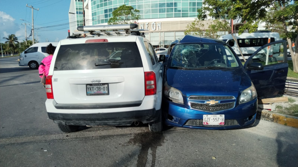 Poco antes de llegar a la avenida Níchupet, el conductor de un Chevrolet Aveo intentó rebasar a una Jeep Patriot para girar hacia la avenida Níchupet y salir hacia la avenida Tulum. Sin embargo, no logró ganarle el paso y terminó impactando el costado de la Jeep Patriot.