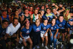 Acompañada de la presidenta municipal Ana Paty Peralta y de la presidenta honoraria del DIF Quintana Roo, Verónica Lezama Espinosa, exhorta a los corredores a poner su máximo esfuerzo