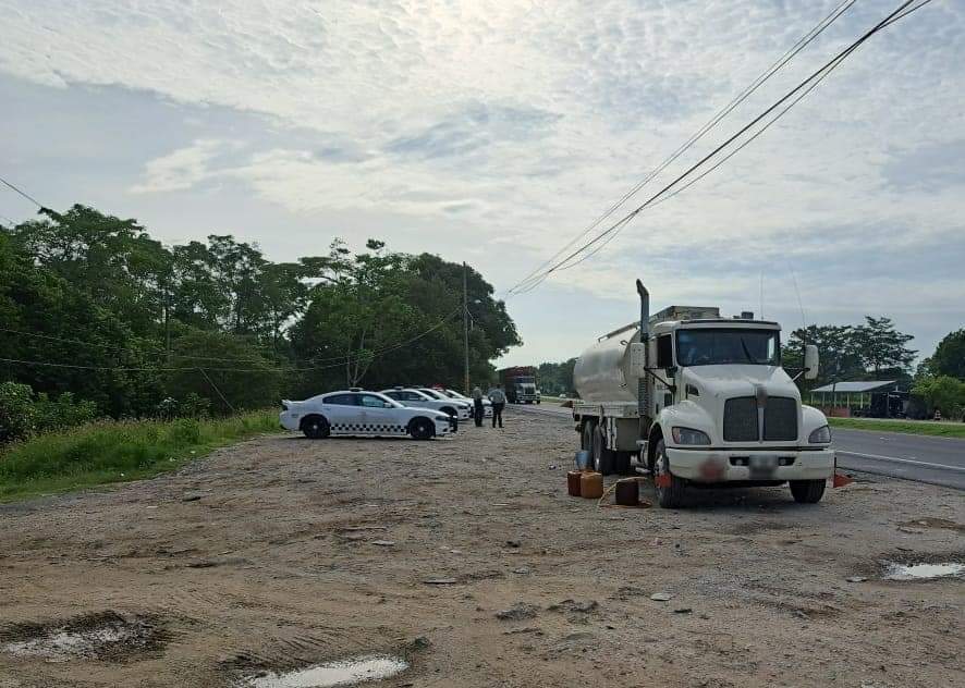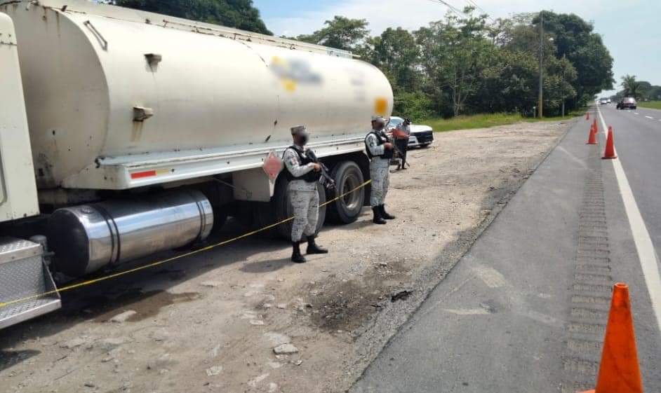 Al realizar patrullajes preventivos y de seguridad en el kilómetro 113+100 de la carretera 813 Cárdenas–Coatzacoalcos, guardias nacionales ubicaron un tractocamión tipo autotanque con las luces intermitentes encendidas y estacionado sobre el acotamiento.