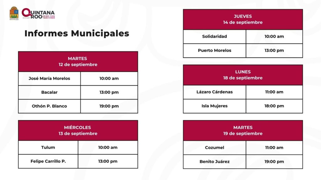 El lunes 18 de septiembre a las 11 horas, le tocará el turno a Emir Bellos, presidente de Lázaro Cárdenas; y ese mismo día a las 18 horas será el informe de Atenea Gómez de Isla Mujeres.