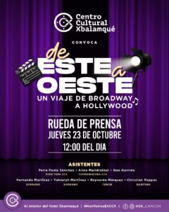Cancún (Marcrix Noticias)-El brillo de Hollywood y la energía de Broadway llegan este sábado 25 de octubre al Centro Cultural Xbalamqué, que se vestirá de gala para presentar el concierto “De Este a Oeste, un viaje de Broadway a Hollywood”, una velada que promete conquistar al público con una selección de los más grandes éxitos del teatro musical y el cine.