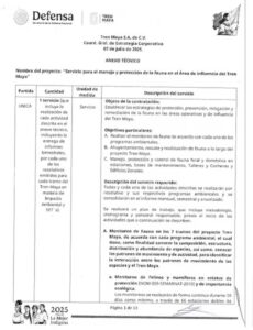 De acuerdo con la licitación pública LA-07-H0M-007H0M001-N-114-2025, publicada en la plataforma Compras MX, el proyecto plantea estrategias de protección, prevención, mitigación y remediación de fauna en los siete tramos del Tren Maya.