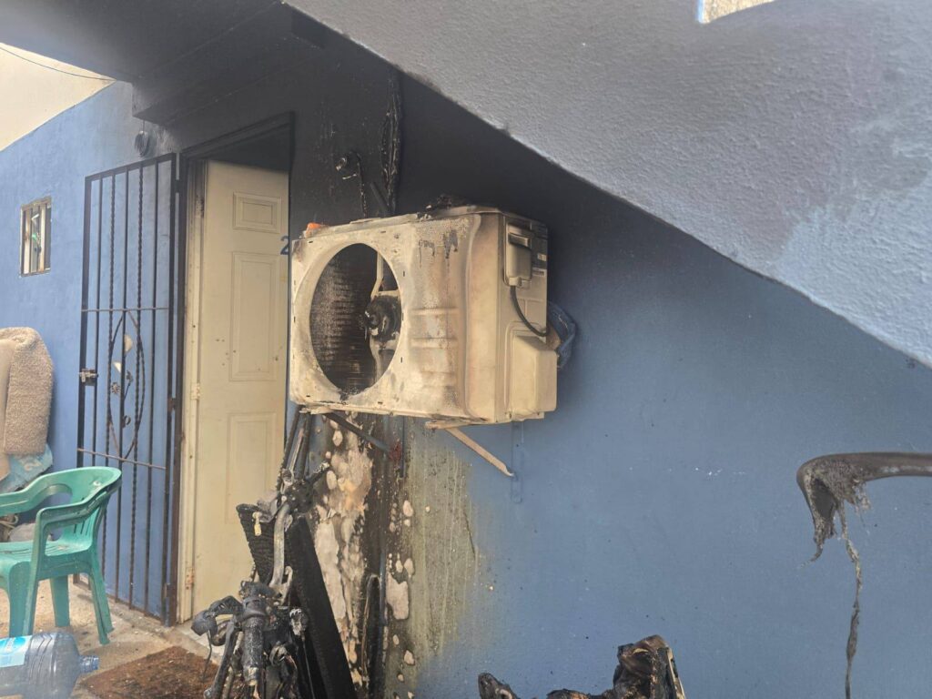 El fuego rápidamente consumió la parte delantera de la unidad y también alcanzó la parte exterior de un aire acondicionado, provocando daños en el equipo instalado en la vivienda.