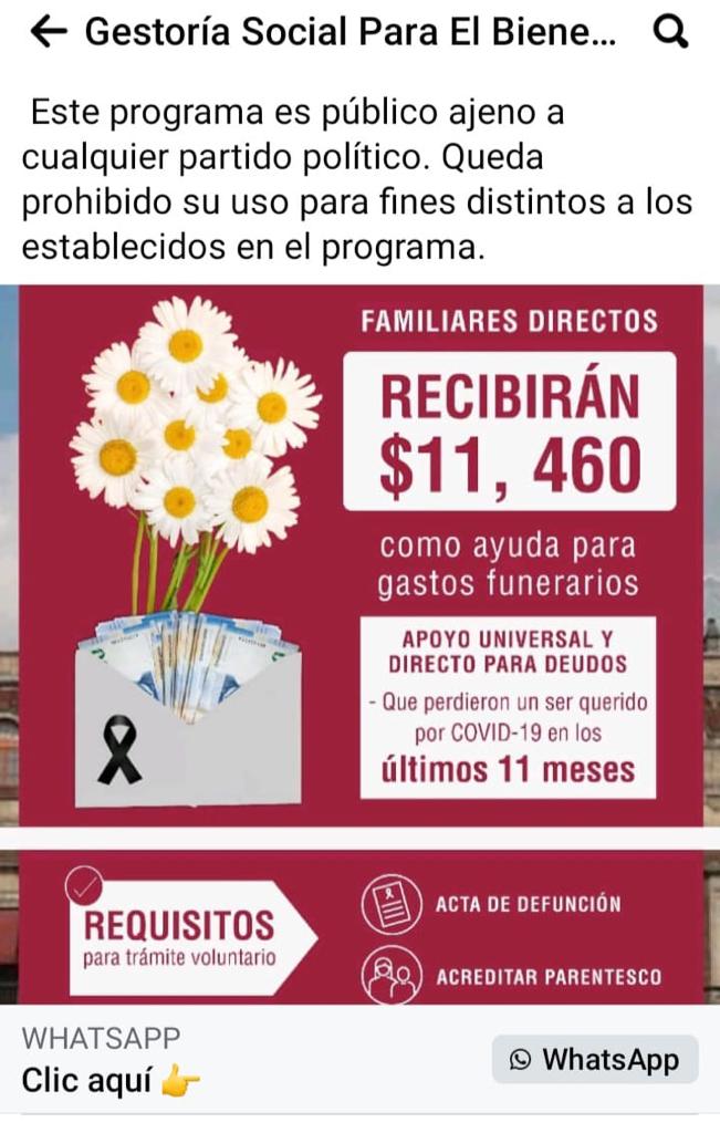 En el mensaje se asegura que familiares directos de las víctimas del COVID, recibirán 11 mil 460 pesos de gastos funerarios.