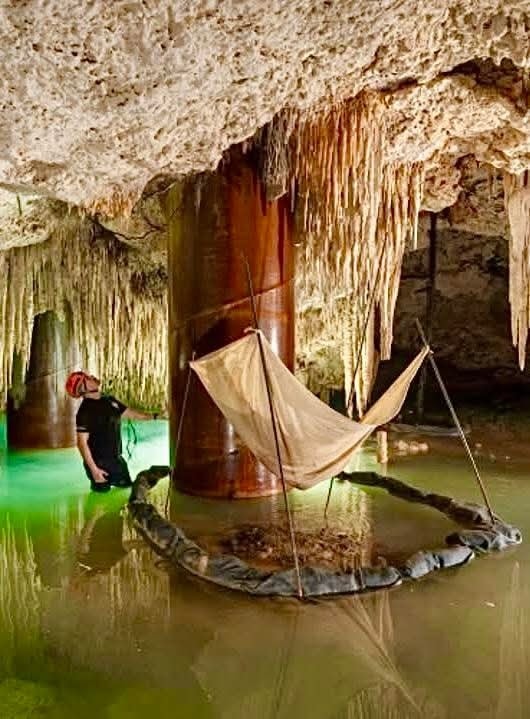 El activista advirtió que el color rojizo en las estalactitas de las cuevas corresponde a óxido, evidencia del deterioro en formaciones naturales milenarias que forman parte del sistema de ríos subterráneos más extenso e importante del planeta.