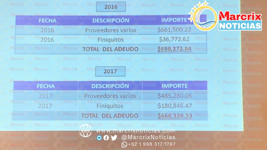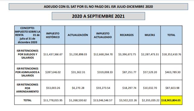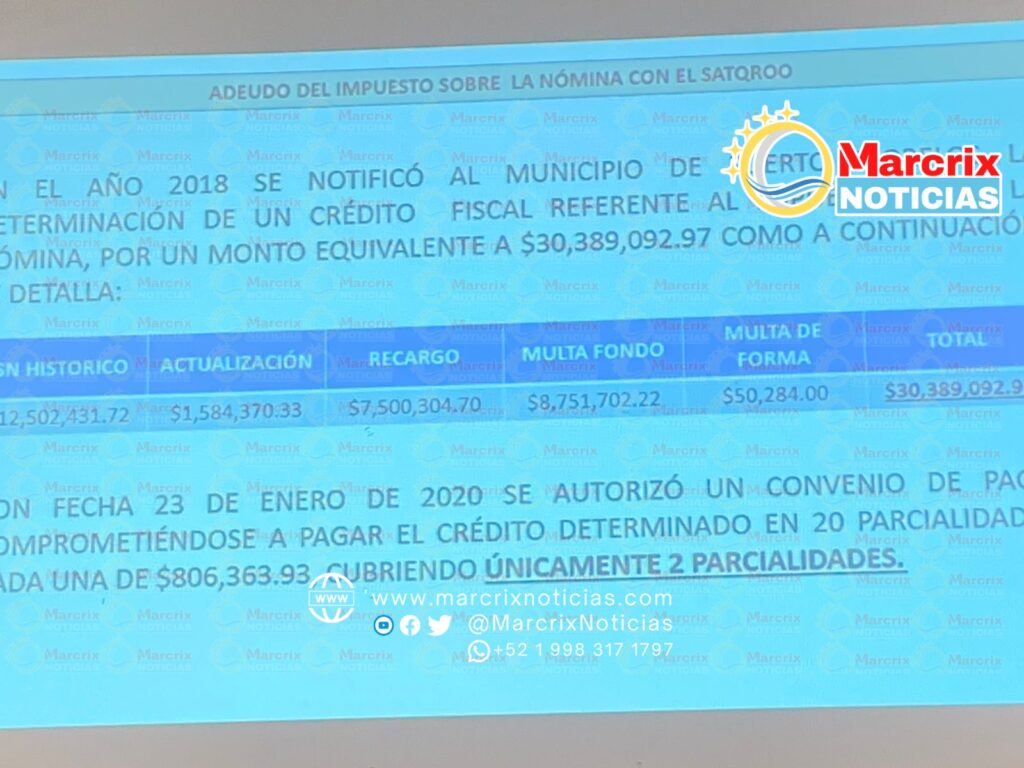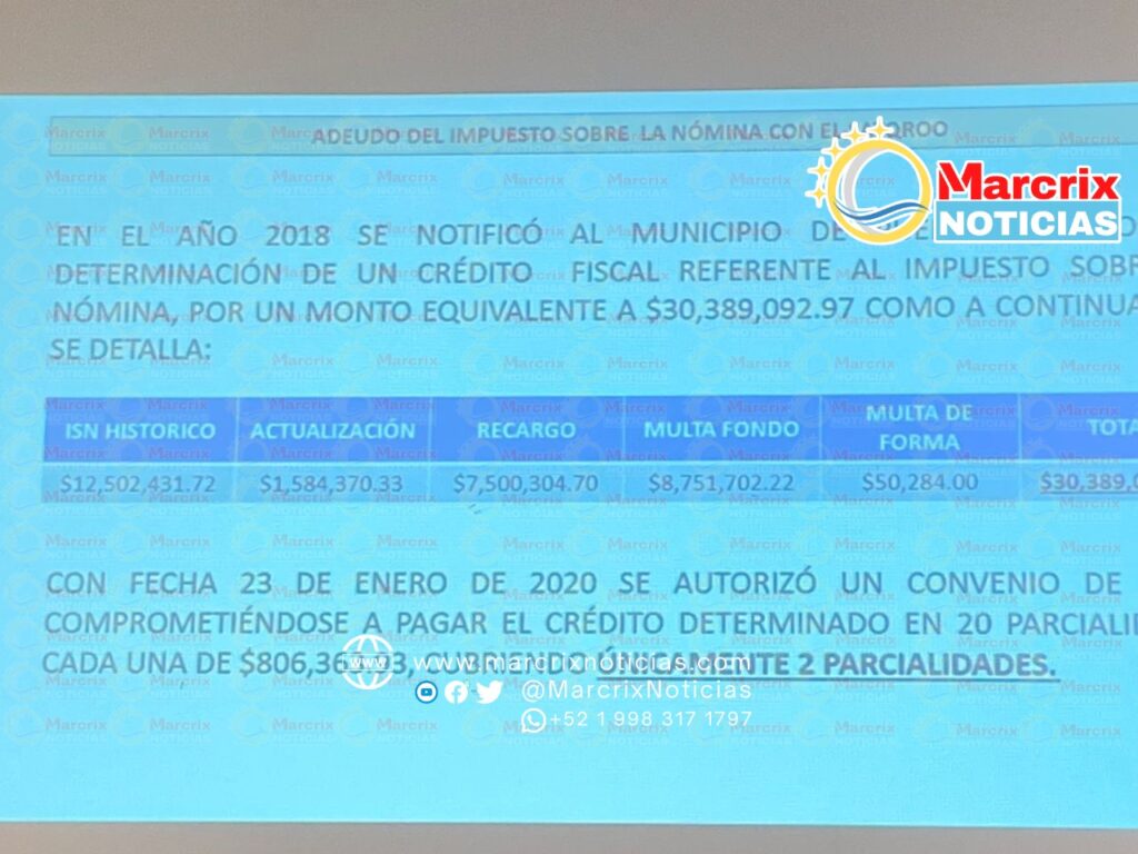 También dijeron que existeu una deuda al SAT Quintana Roo, de un préstamo de 30.3 millones de pesos de 2018; sin embargo, en enero de 2020 se firmó un convenio para el pago, el cua no se cumplió y por lo que aún se adeudan 28.7 millones de pesos.