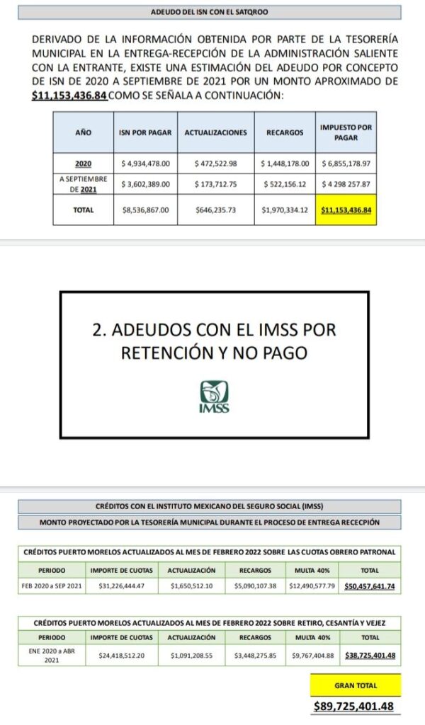 Asimismo, Merari detalló que las cuentas de los pasivos, deudas, compromisos y desvíos que heredaron de la administración de Laura Fernández se encuentran repartidas de la siguiente manera, en lo que respecta a los adeudos con el Instituto Mexicano del Seguro Social (IMSS) por el concepto de retención y no pago, el monto asciende a 89 millones 725 mil 401.48 pesos, mientras que en el Impuesto Sobre la Renta (ISR), la deuda que dejó la pasada administración es de 18 millones 903 mil 804 pesos.