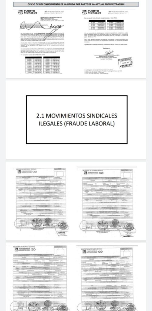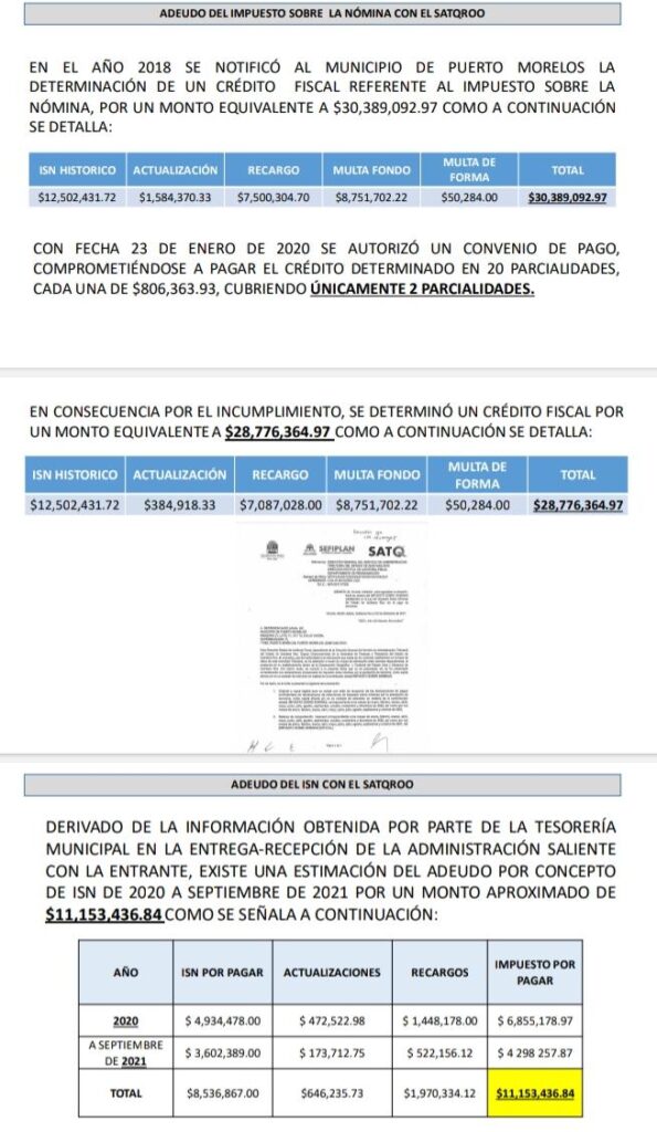 Por su parte, la oficial mayor de Puerto Morelos, Irma Ávila Méndez, detalló adeudos al SAT y al SATQROO y dijo que que la deuda es de 18.9 millones por retenciones por sueldos y salarios, asimilados a salarios y por arrendamiento.