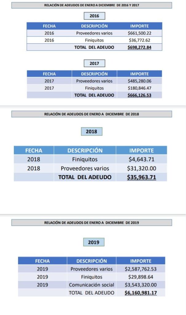 En 2017, el adeudo fue de 666 mil pesos, mientras en 2018 quedaron pendientes 35 mil pesos y en 2019, se adeudaron 6.1 millones de pesos.