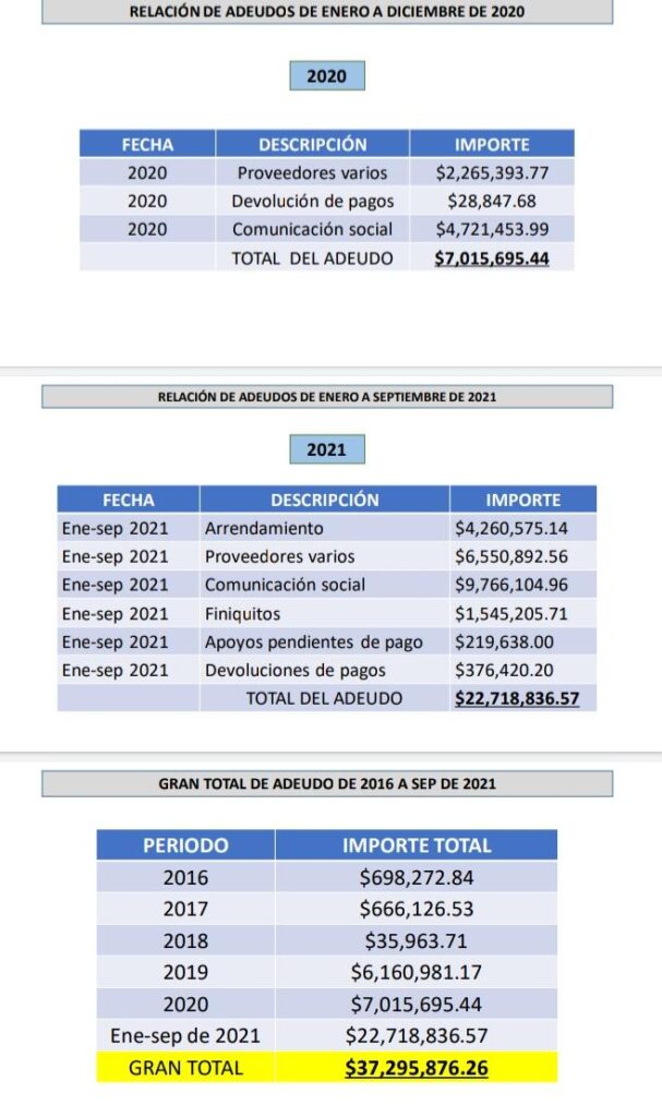 Para el año 2020, el monto que se quedó debiendo fue de 7 millones de pesos, mientras en 2021 fue una deuda de 22.7 millones de pesos.