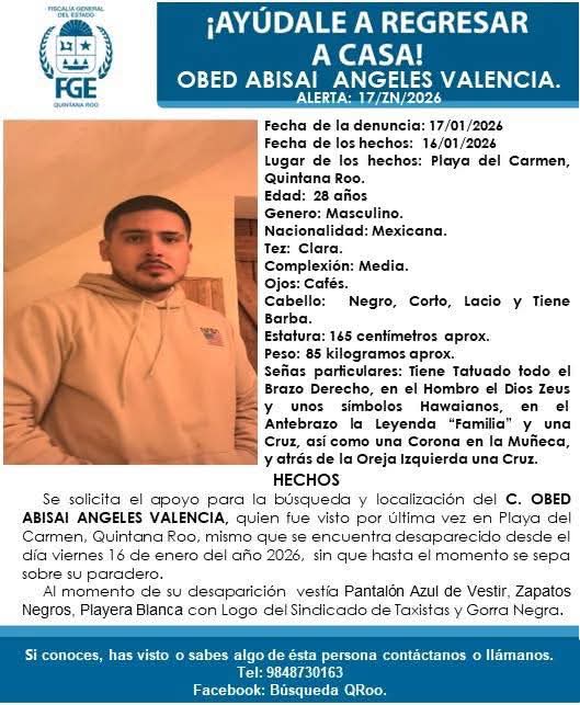 Playa del Carmen(Marcrix Noticias).- Obed Abisai Ángeles Valencia, taxista del Sindicato de Playa del Carmen, desapareció el viernes 16 de enero de 2026, luego de ser visto por última vez sobre la avenida 30, entre Benito Juárez y Constituyentes, cuando se dirigía al Aeropuerto Internacional de Tulum para dejar un servicio.