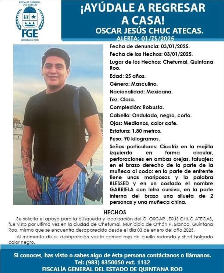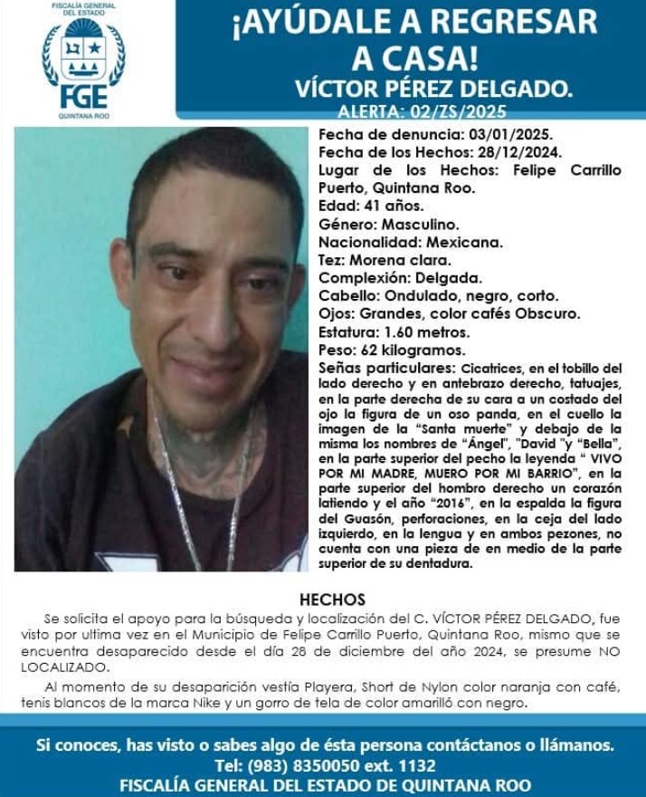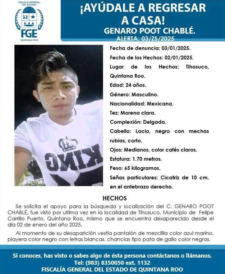 En Felipe Carrillo Puerto, se registraron las desapariciones de Víctor Pérez Delgado, de 41 años, quien fue visto por última vez el 28 de diciembre, y de Gerardo Poot Chablé, de 24 años, quien presuntamente fue privado de su libertad el jueves.