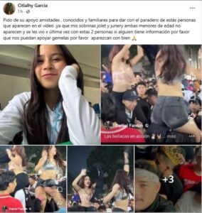 “Pido de su apoyo, amistades, conocidos y familiares para dar con el paradero de estas personas que aparecen en el video, ya que mis sobrinas Jolet y Junery, ambas menores de edad, no aparecen y se les vio por última vez con estas dos personas”, escribió en redes sociales.