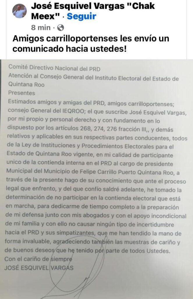 La carta escrita a computadora, con la firma de José Esquivel, fue publicada y a los 30 minutos retirada de la red social, sin embargo fue vuelta a subir a las 22 horas y señala que por el juicio legal que enfrenta y del cual aduce saldrá bien librado, y aun cuando es el único participante en la contienda interna del PRD por la candidatura a la presidencia municipal de Carrillo Puerto, decidió no participar en el actual proceso electoral 2024.