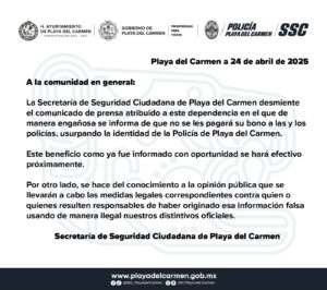Playa del Carmen, (Marcrix Noticias)-La Secretaría de Seguridad Ciudadana de Playa del Carmen desmintió categóricamente un comunicado de prensa falsamente atribuido a la dependencia, en el que se asegura, de forma engañosa, que no se pagará el bono a los elementos policiales.