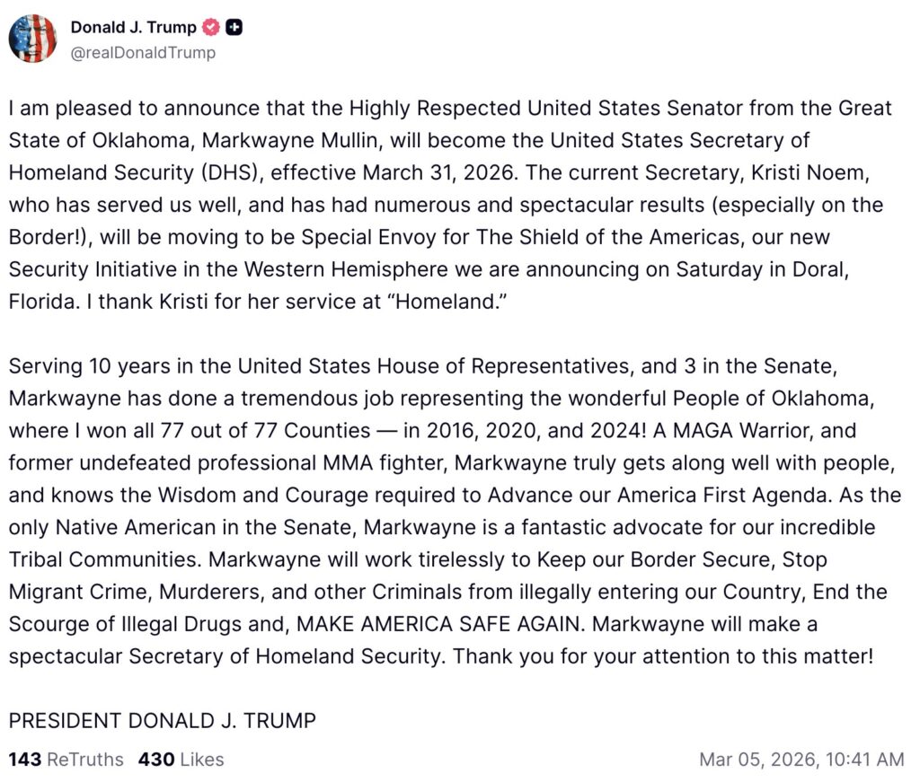 Tras la destitución, el presidente Trump propuso al senador republicano Markwayne Mullin como nuevo titular del Departamento de Seguridad Nacional, nombramiento que deberá seguir el proceso correspondiente en el Senado antes de concretarse.