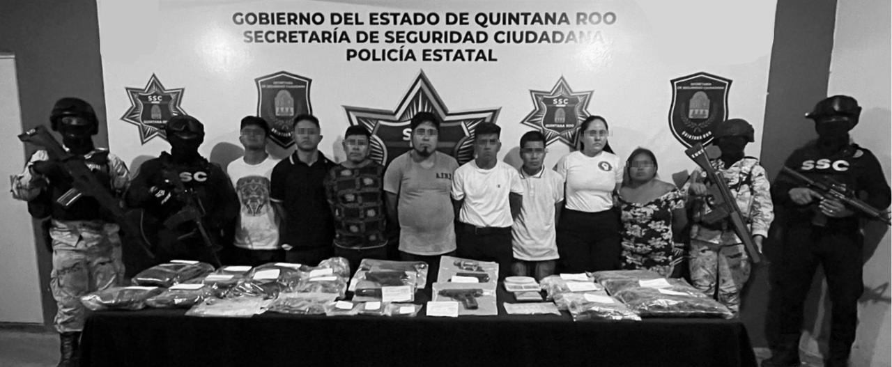 Cancún, (Marcrix Noticias)- En una operación coordinada entre elementos de la Secretaría de Seguridad Ciudadana y la Guardia Nacional, se llevó a cabo la detención de ocho individuos identificados como Jorge “N”, Juan “N”, Hugo “N”, Benjamín “N”, Roberto “N”, Luis “N”, Arely “N” y Beatriz “N”. Se presume que están involucrados en delitos contra la salud y violación a la Ley Federal de Armas de Fuego y Explosivos.