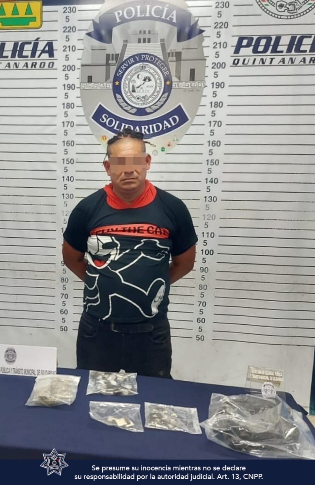 Playa del Carmen, Solidaridad (Marcrix Noticias).- Cuando realizaban recorridos de vigilancia en la colonia In House, policías de la Secretaría de Seguridad Pública y Tránsito Municipal de Solidaridad aseguraron a un sujeto en posesión de 83 posibles dosis de narcóticos.