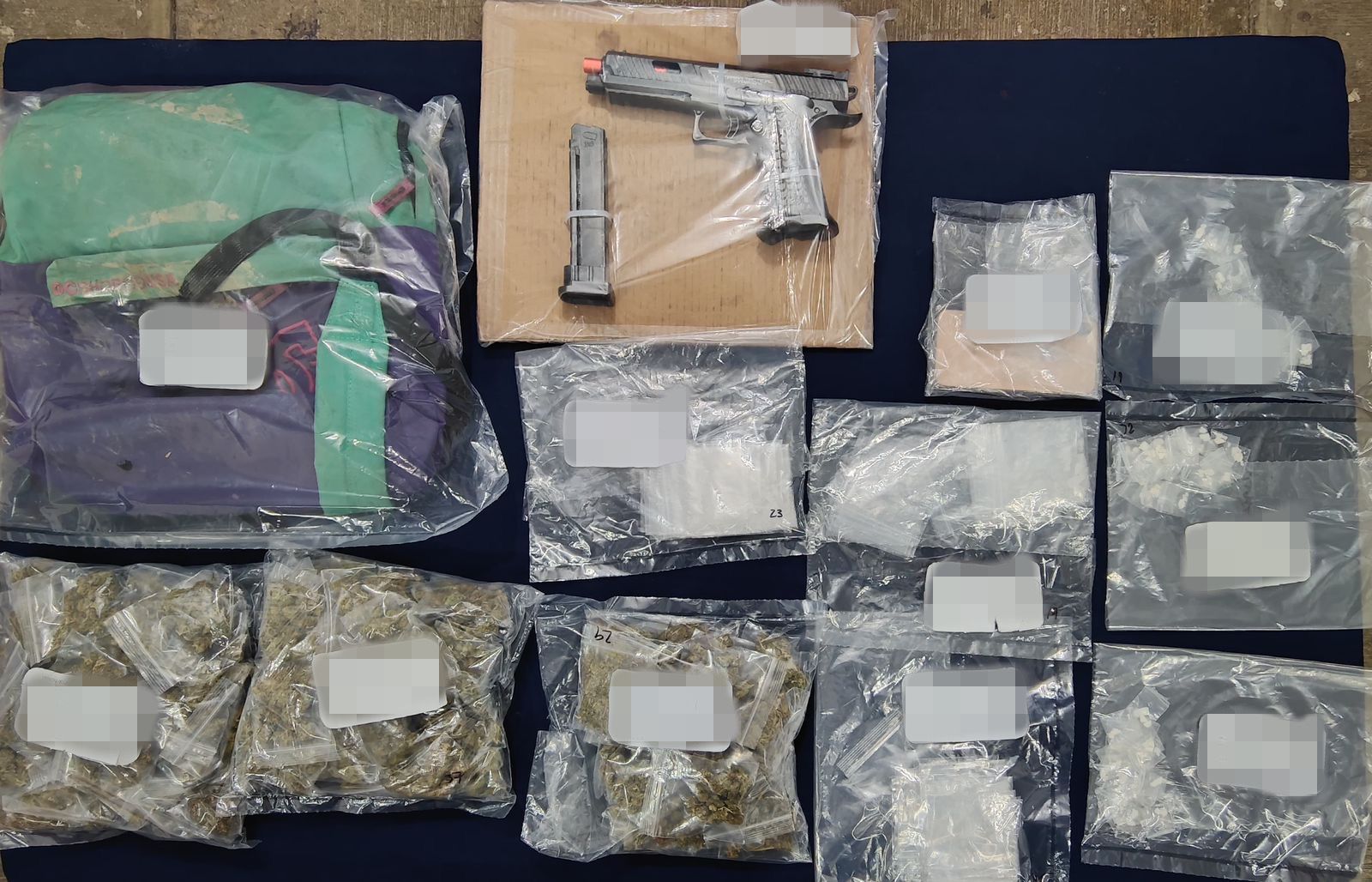 Al realizar la inspección correspondiente, se les decomisó: un arma de fuego color negro tipo escuadra, al parecer de plástico; una mochila verde con morado, 109  bolsitas de plástico con hierba verde y seca con características similares a la marihuana; 59 bolsitas de plástico con una sustancia cristalina con características similares al cristal y 66 bolsitas de plástico con una sustancia sólida color blanco con características similares a la cocaína en piedra.
