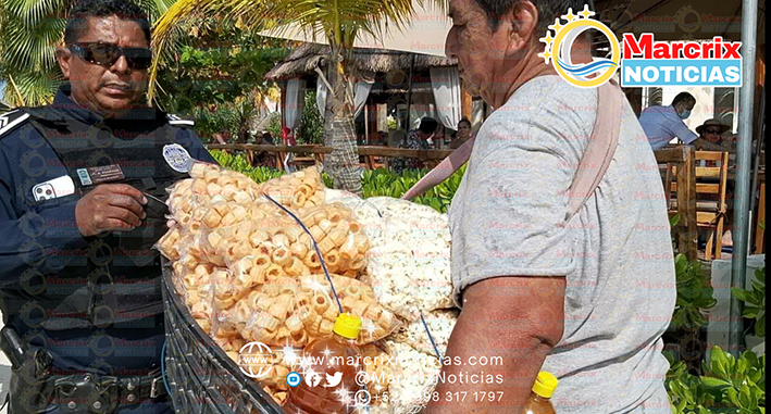 Policías turísticos se identificaron plenamente y frente algunos visitantes procedieron al aseguramiento del producto y del vendedor para su traslado ante el juez cívico de la zona hotelera y ahora no solo perderá su venta si no también tendrá que pagar una multa.
