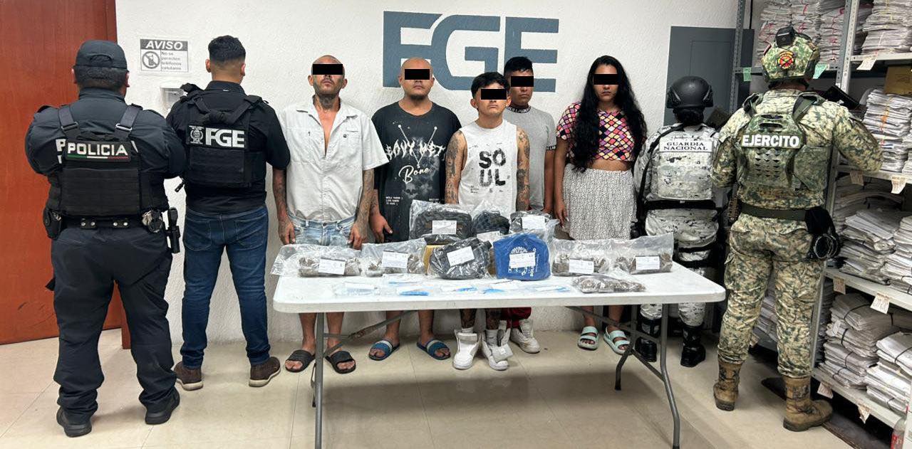 En las inmediaciones del inmueble fueron detenidas en flagrancia cinco personas, cuatro hombres y una mujer, identificados como Ari Uriel “N”, Brayan Abran “N”, Jorge Alejandro “N”, Nicolás Adriano “N” y Yennyfer “N”, a quienes se les aseguraron diversas dosis de hierba verde seca con características propias de la marihuana, así como sustancia granulada con características de la droga conocida como metanfetamina.