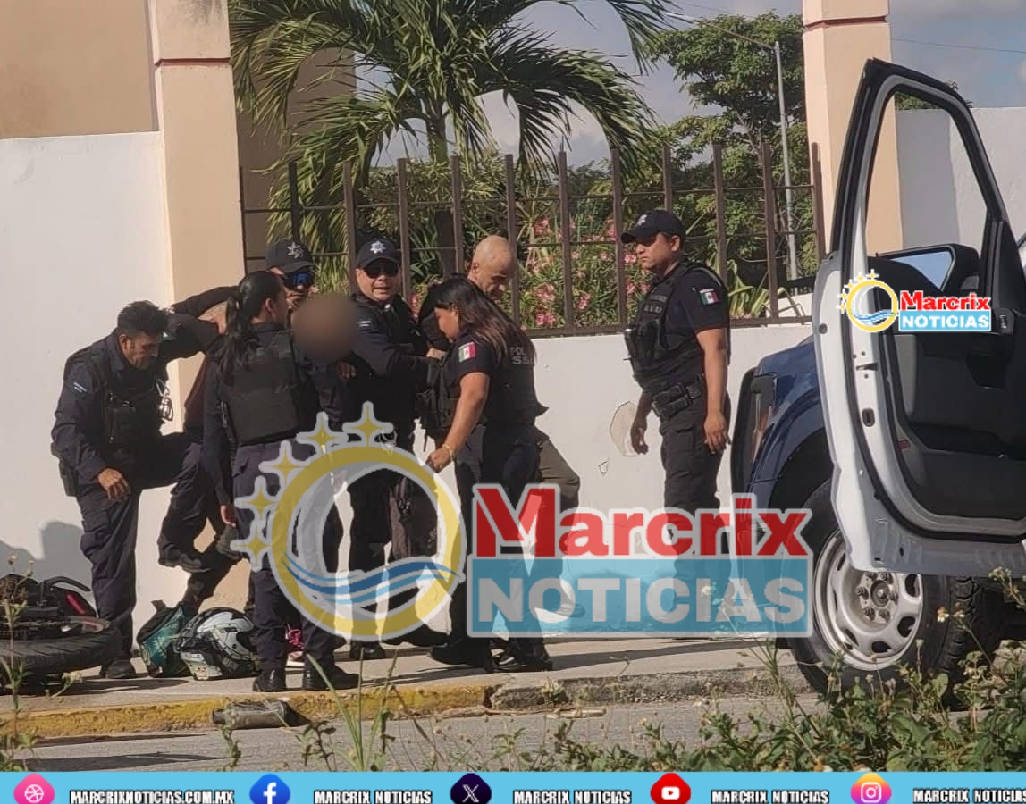 La Policía Municipal detuvo a dos hombres tras una persecución en la región 252 de Cancún, luego de que los sospechosos ignoraron la orden de alto mientras circulaban en una motocicleta por el fraccionamiento Vista Real.