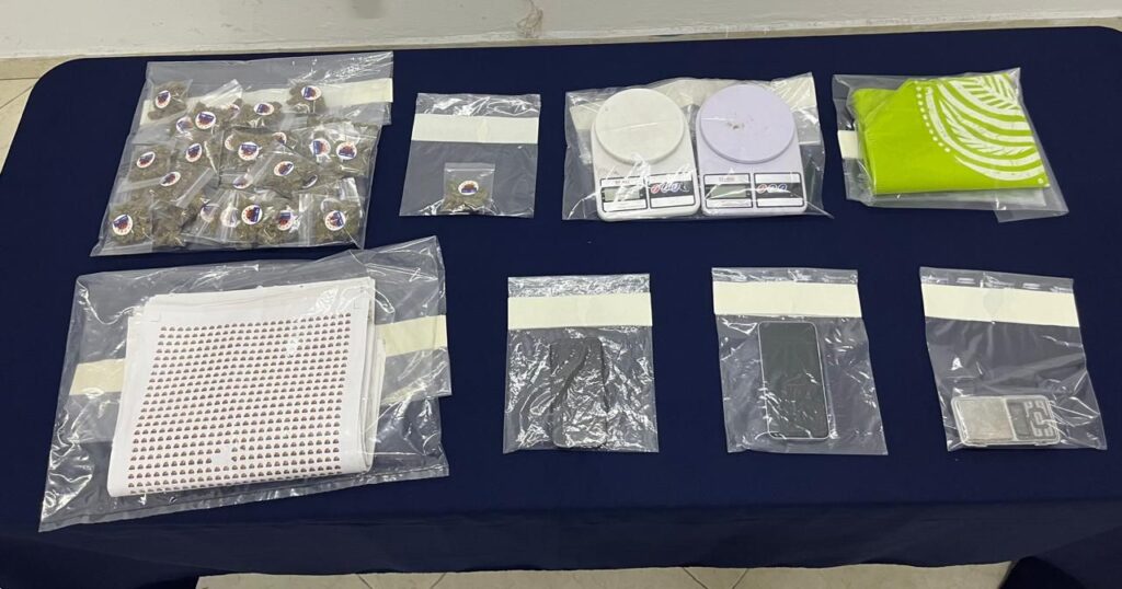 Al momento de llevar a cabo la revisión correspondiente, se les decomisaron 34 bolsitas de plástico transparente tipo “ziploc”, con etiquetas circulares de color negro, rojo, azul y blanco, con vegetal de color verde con las características de la marihuana, dos básculas grameras de color blanco con la superficie redonda y una báscula gramera digital de color plateado.
