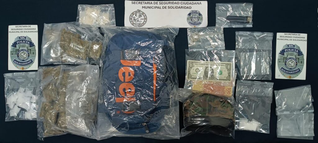 Se les encontró 23 envoltorios de probable cocaína, 21 de posible metanfetamina, 5 envoltorios de probable marihuana, una pipa de cristal transparente y dinero en efectivo.