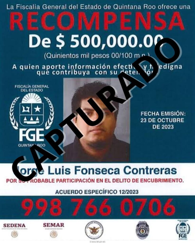 Cabe mencionar que este organismo autónomo ofreció una recompensa de 500 mil pesos, con fecha del 23 de octubre de 2023, a quien proporcionara información efectiva y fidedigna que contribuyera a lograr su detención; sin embargo, en este caso no se aplica, porque fueron personas servidoras públicas las que lograron localizarlo.