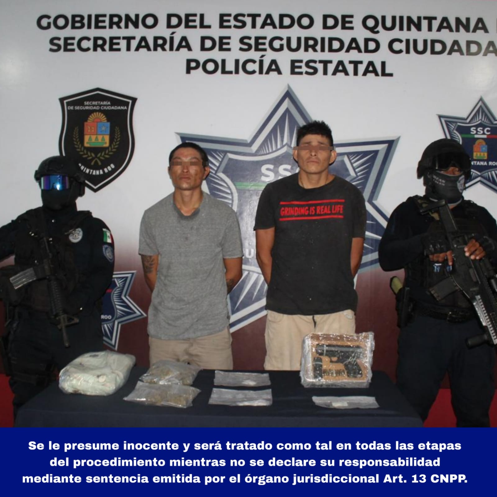 Cancún (Marcrix Noticias).- Secretaría de Seguridad Ciudadana (SSC), en colaboración con la Fiscalía General del Estado (FGE), pone a disposición a dos personas por su probable participación en delitos contra la salud y portación ilegal de arma de fuego, en Benito Juárez.