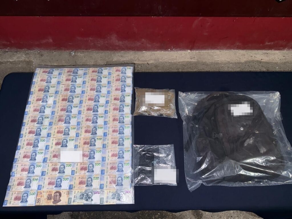 Al realizar la revisión de sus pertenencias se le encontró una mochila color negro, 33 bolsitas de plástico transparentes que contenían en su interior vegetal verde con características similares a la marihuana, la cantidad de 25 mil pesos en billetes de diferentes denominaciones, un celular marca Oppo color negro.