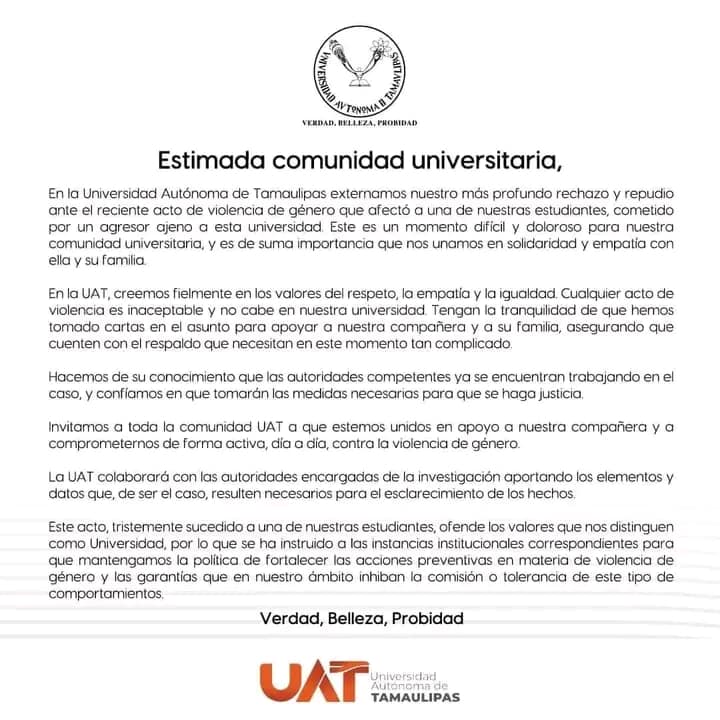 Melanie por su parte convalece de sus lesiones y obtuvo el respaldo total de su casa de estudios la Universidad Autónoma de Tamaulipas.