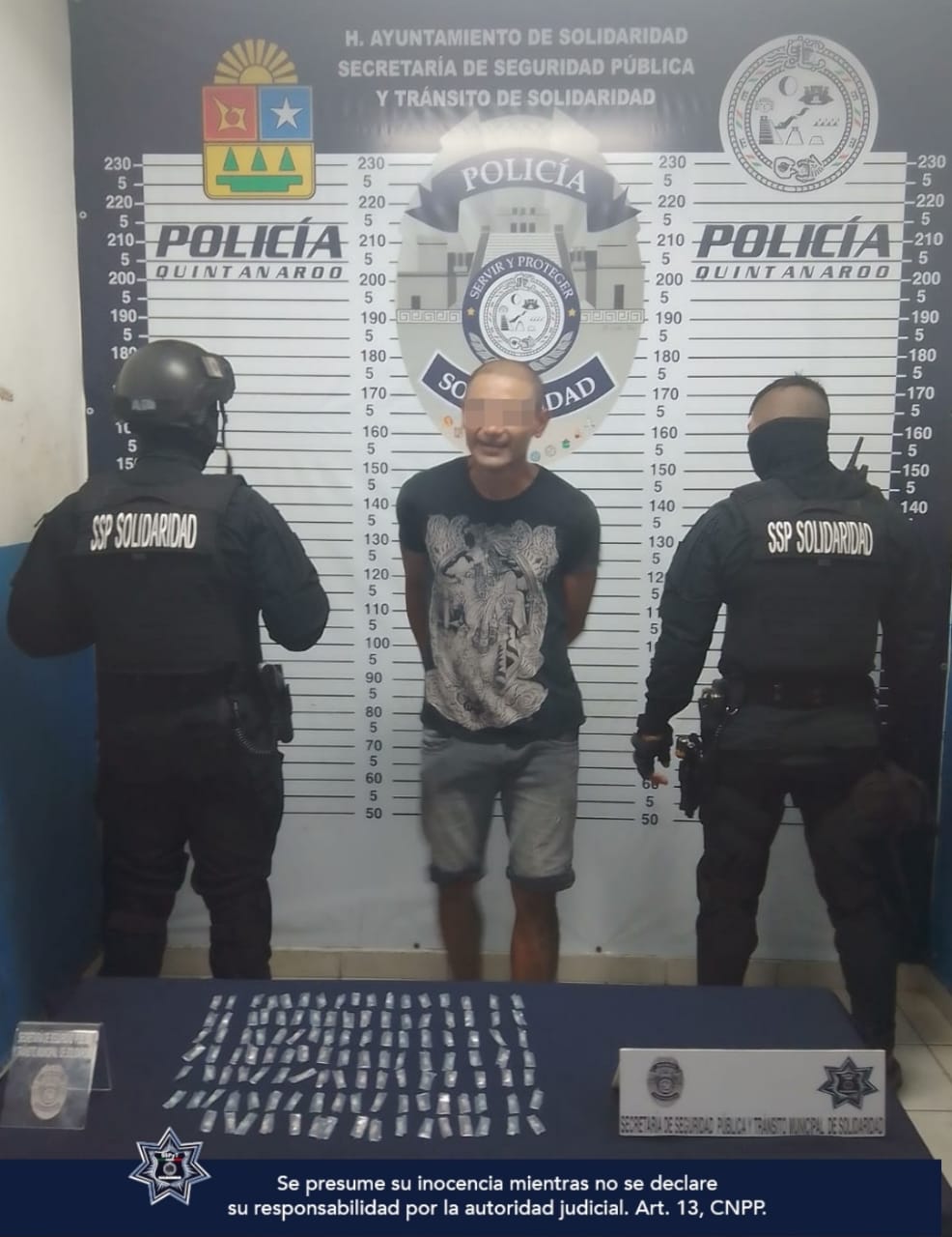 Playa del Carmen (Marcrix Noticias).- Policías de la Secretaría de Seguridad Pública y Tránsito Municipal de Solidaridad dieron alcance y aseguraron a un sujeto en posesión de 118 bolsitas con la posible droga conocida como crack, en las inmediaciones de la colonia Colosio de Playa del Carmen.