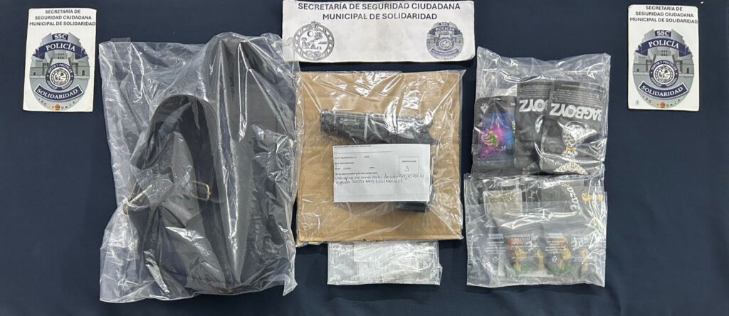 Playa del Carmen (Marcrix Noticias).- Policías de la Secretaría de Seguridad Ciudadana Municipal de Solidaridad detuvieron a una persona del sexo masculino con 9 dosis de posibles narcóticos y una réplica de arma corta, en el fraccionamiento Villas del Sol.
