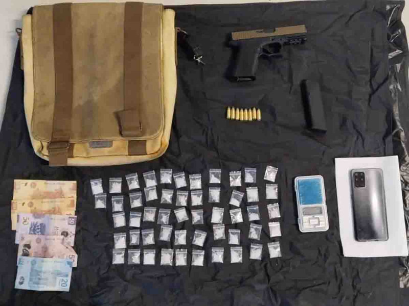 Tras una revisión precautoria, se le encontraron un arma corta abastecida con ocho balas; 52 dosis de una sustancia similar a la droga conocida como cristal, una mochila, dinero en efectivo, dos celulares y una báscula digital.
